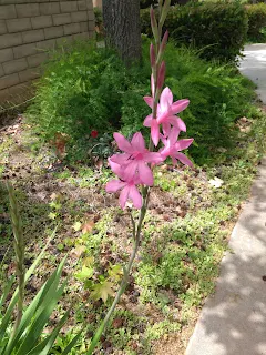In the background is the small red rose that's struggling along in the shade, under a tree and next to an asparagus fern. It is likely the rootstock of something that used to be there or it could be a miniature. I dislike hodgepodge gardens that likely no thought of anything other than 'put something there' went into it. You can also see a seedling/root sprout from the Liquidamber behind the Watsonia. Sigh.