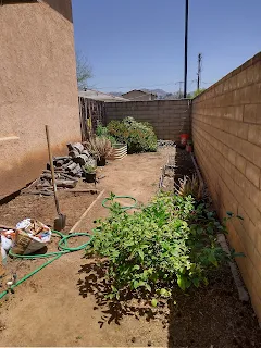 The garden in the evening. Doesn't look like much when you look down the wall, it holds so much promise and yet, can't plant anything because of subterranean rodents.