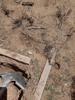 The two holes are new. Those are right next to the north bed so very sound evidence that I can't plant anything in the ground until I get the netting down. All those root clumps are what I dug up in that bed. Whatever was growing in there before (my tomato? Sunflowers?) left a lot behind but there were larger roots that indicated something more tree like. Lemon tree?