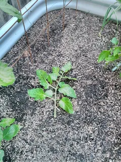 I also transplanted the onion that was being shaded by the tomato in the right corner and it survived just fine, once again using that scoop instead of the trowel because it's shaped better.