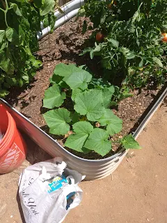 Cucumbers are still flowering and I tickled them best I could to simulate being pollinated. Will see what happens. Didn't water as I was in a bit of a rush to get out of the sun.