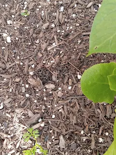 One lone red spud, about the same size as the other large one I dug up. I am most definitely going to curb my impatience and let the rest of the plants grow more. Again there were small red buds on the stem under the soil so I dug around to replant it and there was a huge fat worm. Yay! I now am thinking they are definitely coming up from the soil below, which is great.