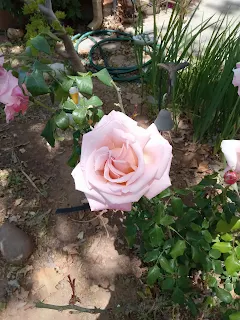 One of the other roses is blooming and I know this one by heart, Paradise. It's one that I had picked out (nameless at the time) for one of my kids when we had a house. I cut the two roses that had been broken off and put those in the compost, then on the way back cut off one of the other ones to take upstairs. And that other picture? A carrot. A freaking carrot somehow came up right next to the cilantro. Looks like I'll just cut down the cilantro to give that more light.