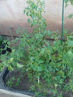 What it looked like after I watered it in this evening. I sprinkled some around the tomatillos of course and some more in the raised bed around the tomatoes and in the middle. The lone poblano fruit, sadly is getting sunburned. I think those and the other peppers, despite them being hot peppers, given the weather, need to be planted much earlier.